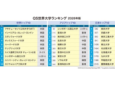 QS世界大学ランキング 2026年版」では、米国のMITやスタンフォード大、英国のオックスフォード大など、米英の大学がトップ10のうち8校を占めた。アジア最上位はシンガポール国立大の8位。日本は東京大が36位、京都大(57位)、東京工大(85位)、大阪大(91位)の4校のみが100位以内に入っている。