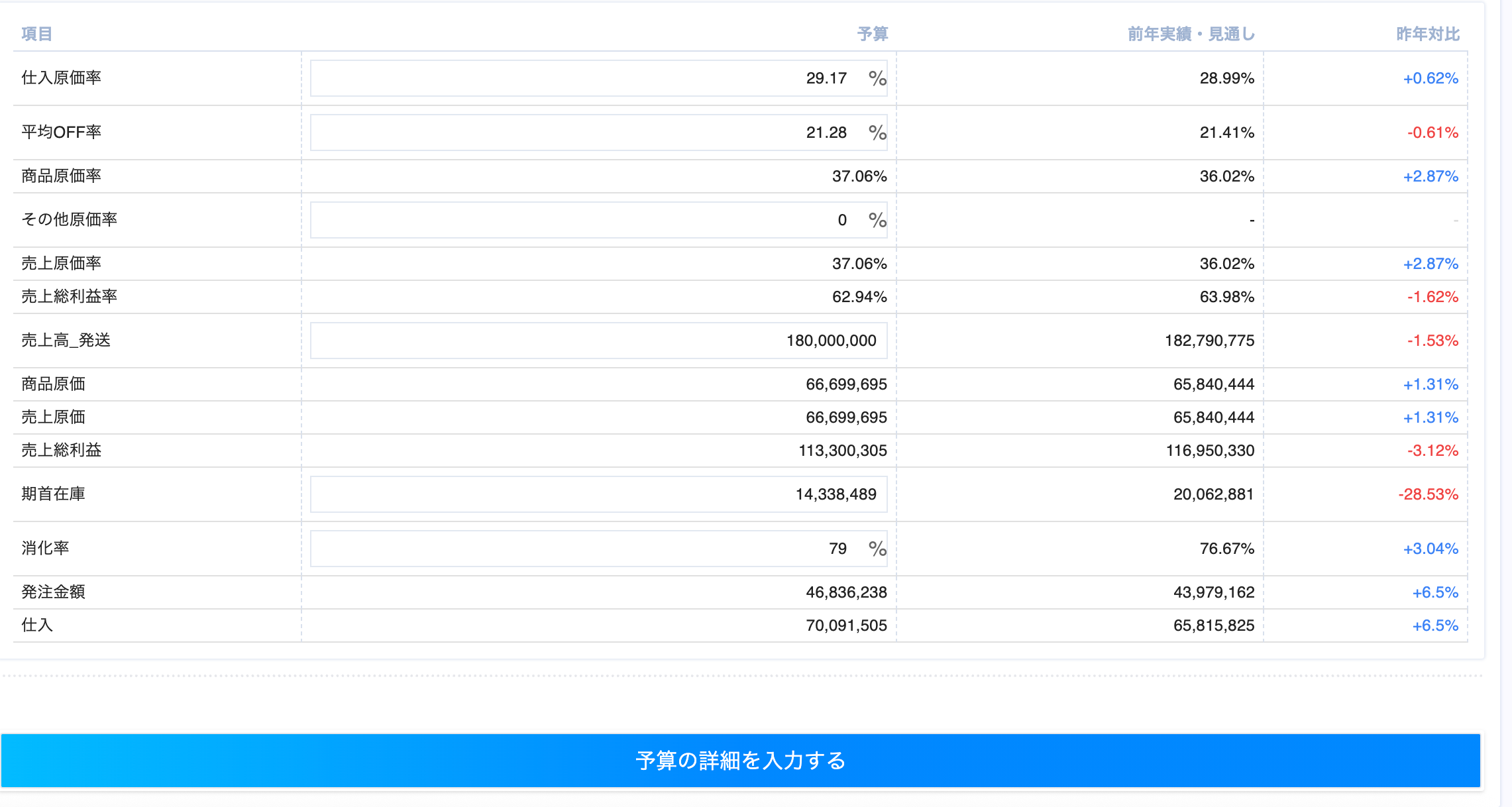 特に経験の浅いMDの方だと、売上目標に対してどの程度仕入をすればいいのかわからないので、仕入れを増やしすぎてしまうといったケースが多いので、消化率をKPIとして入力することで、無謀な仕入をしない予算設計が可能になります。また月次の予算は前年の実績・見通しを元に按分して作成するため季節要因を考慮した予算を作成することができます。