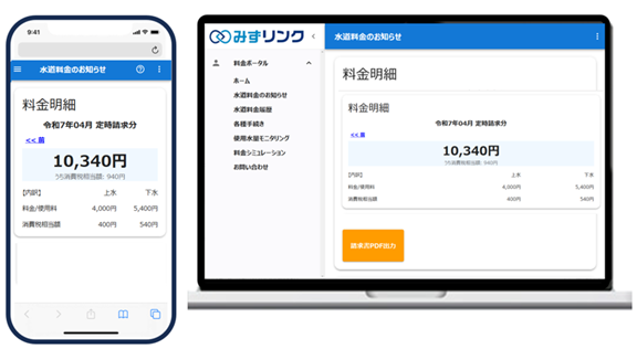 「みずリンク+」は、住民がインターネットを通じて自宅の水道使用量・料金履歴を確認できるWebサービスです。従来の紙の検針票に代わり、過去の利用履歴や使用傾向のグラフ表示、漏水や異常使用の通知機能などを備えています。また、地方自治体への問い合わせ機能や、Excelデータ出力にも対応しています。