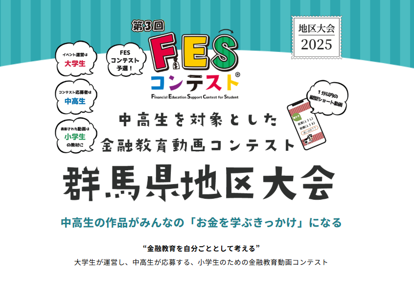「人生の選択肢を増やす金融教育を」を理念に、生き抜く力につながる金融教育を支援する一般社団法人日本金融教育支援機構(共同代表理事:平井梨沙・阿部奈々、所在地:東京都千代田区、以下「当機構」)は、中高生が金融教育動画を制作・発表する「FESコンテスト(R)」の一環として、群馬県で初めてとなる地区大会を開催いたします。