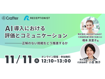 株式会社クラフター(本社:東京都、代表取締役:小島舞子)は、株式会社RECEPTIONIST 代表取締役兼代表執行役員CEOの橋本氏を招き、法人における生成AI活用をテーマにした無料オンラインセミナー「AI導入における評価とコミュニケーション ── 正解のない挑戦をどう推進するか」を2025年11月11日(火)に開催いたします。モデレーターは、株式会社クラフター代表取締役の小島舞子が務めます。