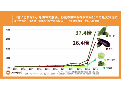 利用者数No.1レシピサービス「クックパッド」を運営するクックパッド株式会社は、10月の食品ロス削減月間に合わせて、家庭での野菜冷凍保存の検索動向を調査しました。調査の結果、小松菜やナス、ゴーヤなど手頃な野菜の冷凍保存検索が2015年比で平均約17倍、ゴーヤに至っては約37倍と大幅に増加。特に2024年から2025年10月にかけて急増しており、「まとめ買いをした」「頂き物が多すぎる」「家族の予定が合わず消費できない」といった"食べきれない現実"に対し、家庭が「一度冷凍して時間を止める」という新しい生活知を確立していることが明らかになりました(※1)。