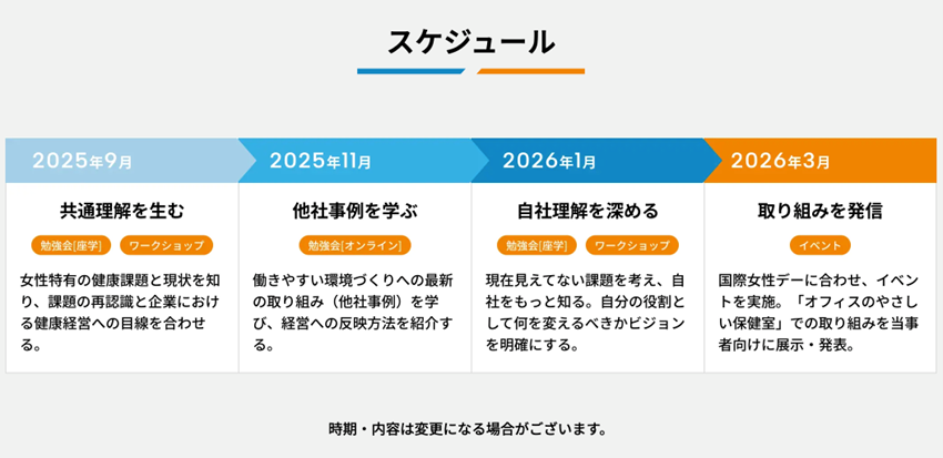 参加企業の皆さまには、ヘルスケアやマネジメント、女性特有の健康課題に関するリテラシー向上のためのe-ラーニングのご提供に加え、9月・11月・1月に開催する勉強会を開催します。また、沖縄タイムス社による紙面及びWebを通じた企業の取り組みの発信・PR、さらに3月に予定しているイベントでの情報発信も予定しています。