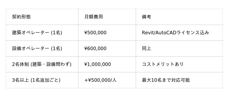 自社で雇用する場合に発生する採用コスト、教育コスト、福利厚生費が一切かかりません。 Revit/AutoCADライセンス費用込みの月額制で、自社雇用と比較して年間200万円以上のコスト削減も可能です。 これにより、採用コストを最大70%削減し、プロジェクトの進行を90%効率化します。