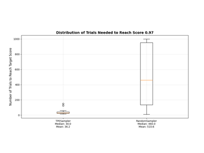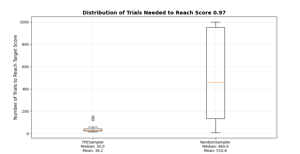 HelixMindを使用した試験デザインに従うと、ランダム探索に比べて15分の1の試験回数で同等レベルの解に到達する