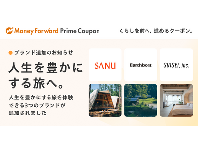 マネーフォワードホーム株式会社は、お金の見える化サービス『マネーフォワード ME』プレミアム会員限定「Prime Coupon(プライムクーポン)」の第四弾として、本日2025年10月24日(金)より新たなクーポンを提供開始します。第四弾は「人生を豊かにする旅へ。」をテーマに、国内最大級のシェア別荘サービス『SANU 2nd Home』を提供する株式会社SANU、プライベートサウナ付きアウトドアホテル『Earthboat』を提供する株式会社アースボート、『HOTEL SHE, OSAKA』や『香林居』などを運営する株式会社水星の3社を新たにパートナー企業として迎えました。