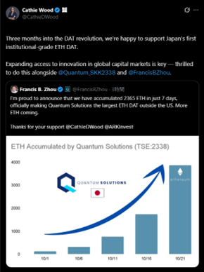 「DAT革命が始まってわずか3か月、私たちは日本初の機関級ETH DATプロジェクトを支援できることを嬉しく思います。グローバル資本市場の革新へのアクセスを広げることは極めて重要です。- @CathieDWood」