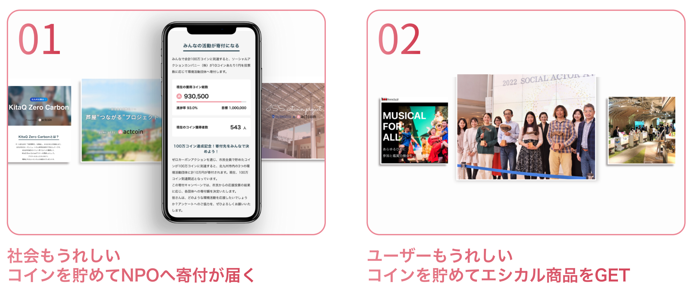 「actcoin」は、ユーザーがオンライン・オフラインで社会貢献活動に参加するたびにデジタルポイント(以下、コイン)が付与されるアプリケーションサービスです。例えば、ボランティアへの参加・寄付・地球や社会に生活の中で配慮した活動の実践報告を行うことでコインが発行・付与されます。アプリケーション上では、これまでに行った社会貢献活動が可視化されます。これにより下記のようなメリットが期待できます。