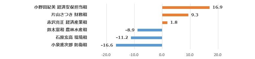 また、「期待できる」と「期待できない」の差(ネットスコア)をとると、上位は小野田経済安保担当相+16.9ポイント、片山財務相+9.3ポイント、赤沢亮正経済産業相+1.8ポイントの順となった。また、下位は小泉防衛相-16.6ポイント、石原宏高環境相-11.2ポイント、鈴木憲和農林水産相-8.9ポイントとなった。