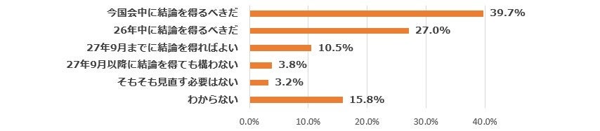 自民・維新の連立政権合意書は、企業・団体献金の取り扱いについて、両党で協議体を設置し、高市自民党総裁の任期中(2027年9月まで)に結論を得るとしている。与野党は当初、25年3月末までに結論を得ると申し合わせていた経緯があるが、27年9月までとする日程について、自身の考えに最も近いものを選んでもらうと、「今国会中に結論を得るべきだ」が39.7%で最も多く、「26年中に結論を得るべきだ」27.0%、「27年9月までに結論を得ればよい」10.5%、「27年9月以降に結論を得ても構わない」3.8%、「そもそも見直す必要はない」3.2 %と続いた。「わからない」は15.8%。