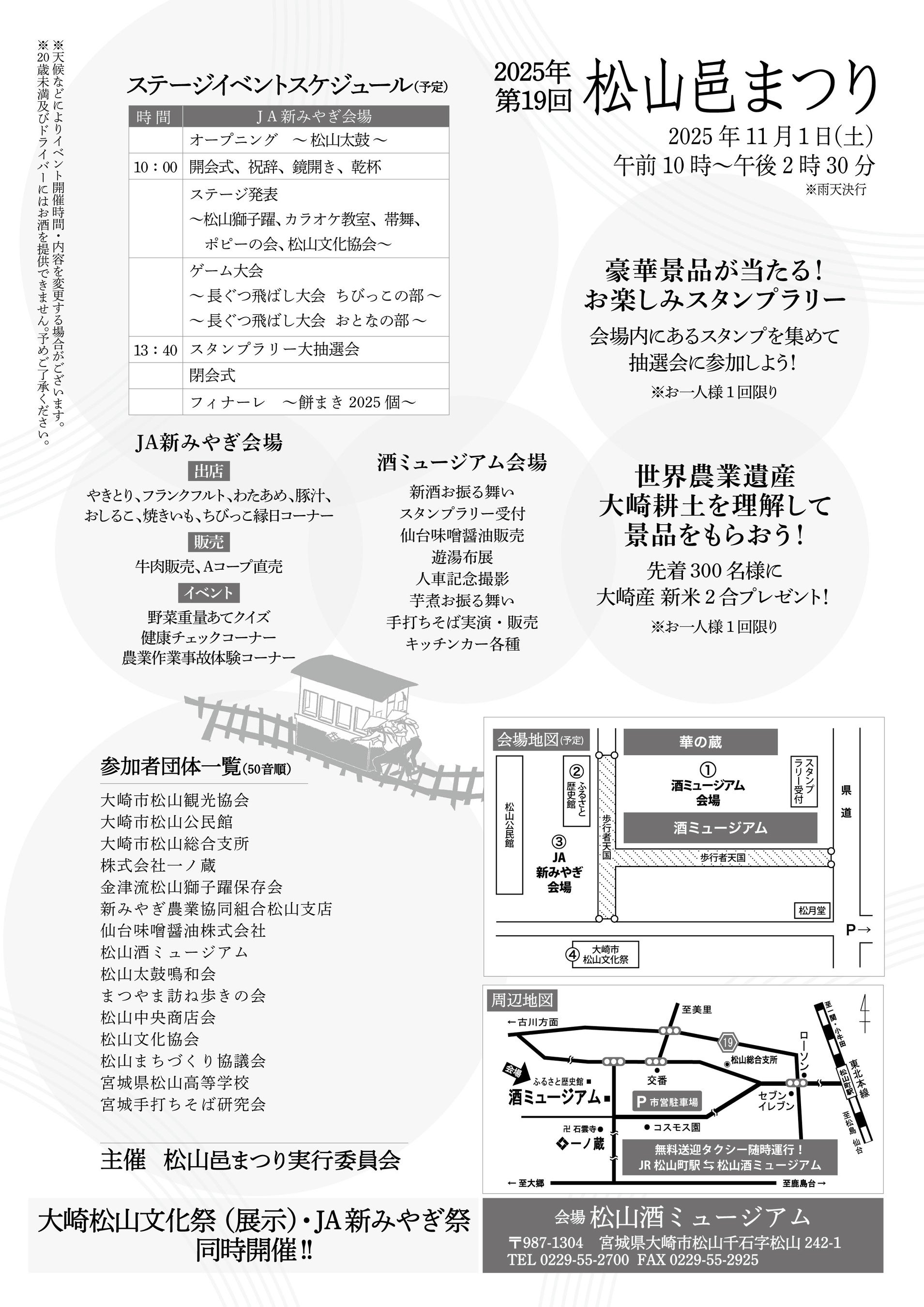 2025年11月1日(土)、松山酒ミュージアム(宮城県大崎市松山)にて『第19回 松山邑まつり』を開催します。