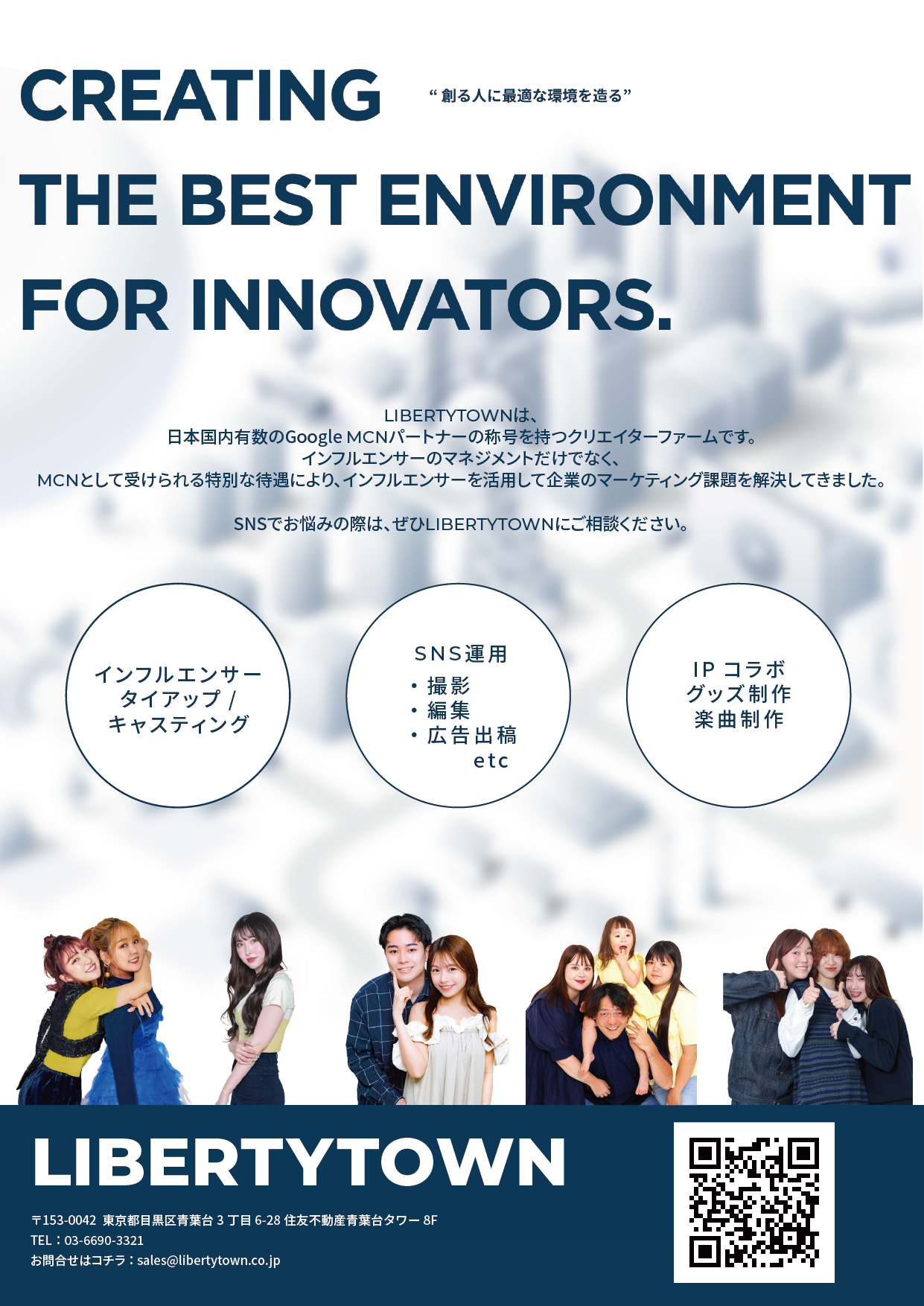 ・事業内容:株式会社リバティタウンは2017年5月に創業、”創る人に最適な環境を造る”をテーマにクリエイターファームを運営しております。YouTubeのMCNであるリバティタウンだからこそできるマネジメントは、チャンネル開設から最大化まで全面サポートいたします。SNS戦略サポート、動画編集の講習、企業タイアップの提供などクリエイターが『創る』に最大限のチカラを発揮できるプロダクションです。企業タイアップ広告や企業公式アカウント運用についても弊社にお任せください。