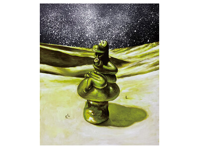 ネオ・シュルレアリスムとも呼ばれるこの幻想的な風景画は、伊藤が実際に旅先で訪れた山道や、自身が撮影した風景、そして自身が蒐集してきた置物や雑誌の切り抜きをもとに構成されており、日常生活の断片がコラージュされるように描き出されています。黄緑色の大地は、CG 映像制作におけるグリーンバックを思わせる無機質さを帯びていますが、そこにはシュミラークルな世界を否定も肯定もせずに受容するまなざしがあります。
