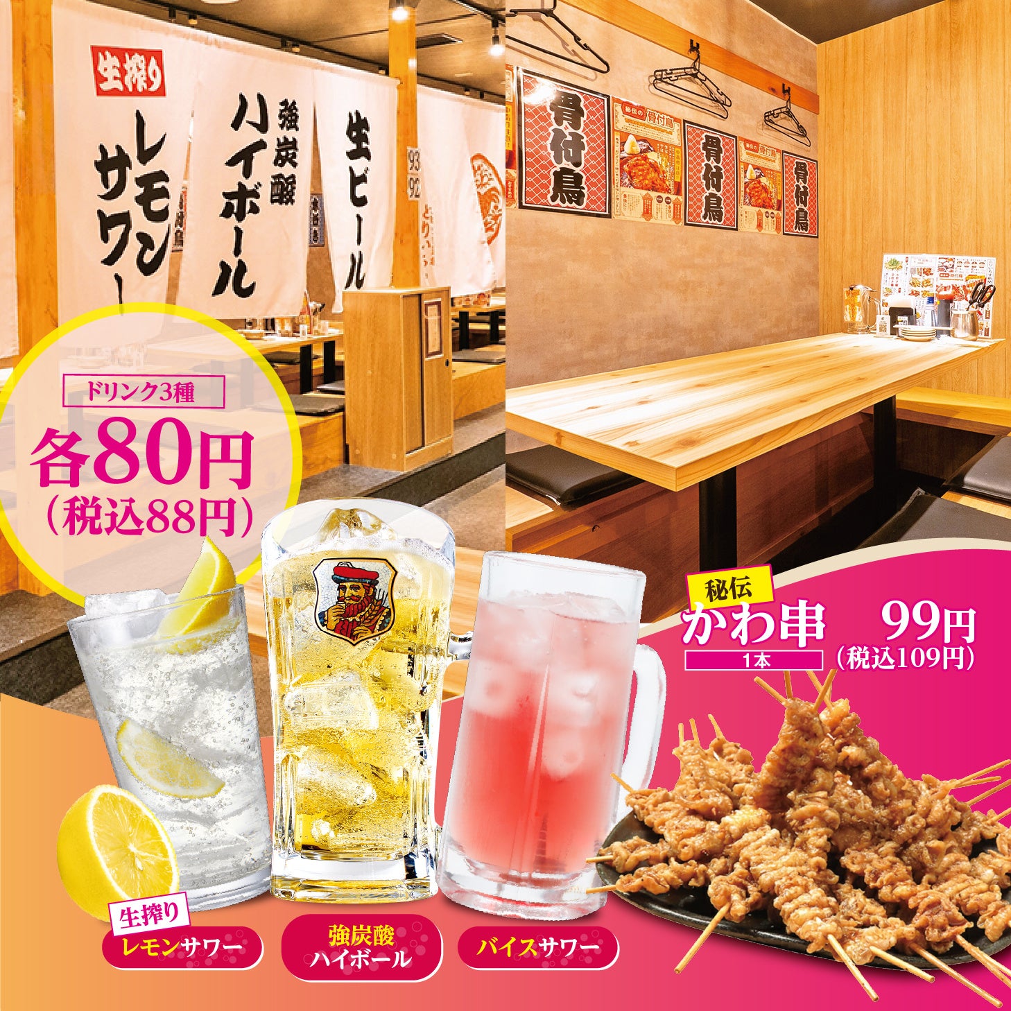 ・ 秘伝のかわ串:パリじゅわ食感がやみつきになる1本99円(109円)の名物串。