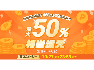 めちゃコミック(めちゃコミ)」WEB版において、2025年10月27日(月)00:00から2025年10月27日(月)23:59までの24時間限定で、人気漫画800作品を対象に「最大50%ポイント還元キャンペーン」を実施します。