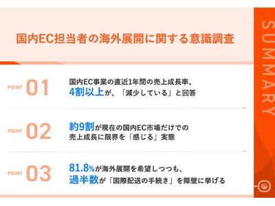 今回の調査では、多くの国内EC担当者が売上成長の鈍化を実感し、海外市場への展開に強い関心を持ちながらも、具体的な一歩を踏み出せずにいる実態が明らかになりました。国内市場の成長が頭打ちになる中、越境ECは新たな成長機会として注目されています。言語対応や国際配送などの課題をクリアし、初期投資を抑えられるプラットフォームやサポート体制の充実が、越境EC普及の鍵となるでしょう。