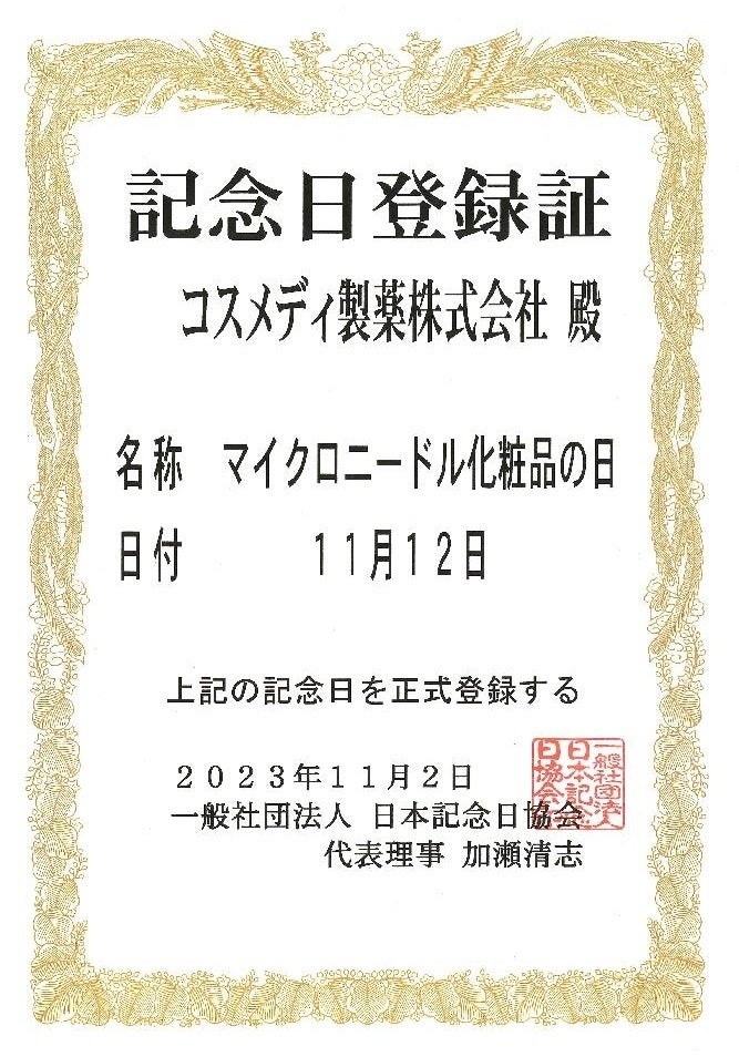 このマイクロニードル化粧品を上市した11月12日を「いい(11)皮膚(12)」の語呂合わせから記念日として制定。一般社団法人日本記念日協会(事務局:長野県佐久市/代表理事:加瀬 清志氏 )より「マイクロニードル化粧品の日」の認定を受けました。