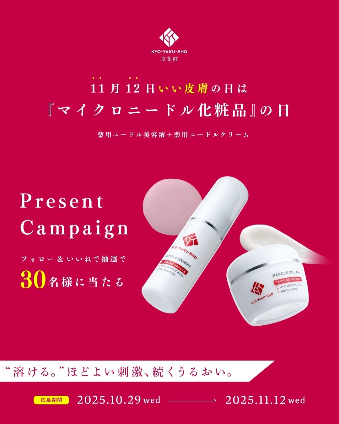 【賞品】 キャンペーンご参加者の中から抽選で30名に京薬粧 薬用ニードル美容液、薬用ニードルクリームを各1個プレゼント
