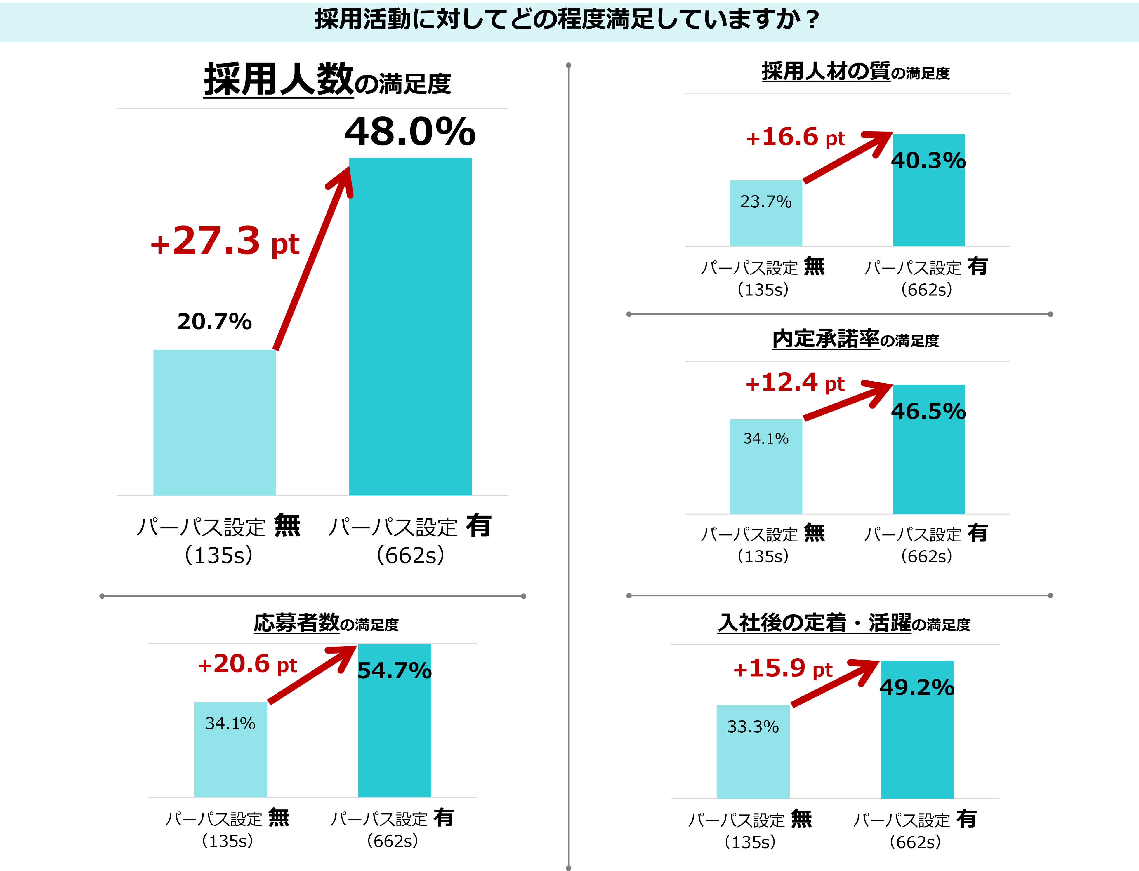 パーパスを設定している企業の採用活動の満足度は高くなる傾向があり、「採用人数」では27pt、「採用人材の質」では17pt、「内定承諾率」では15ptも満足度に差が出ました。