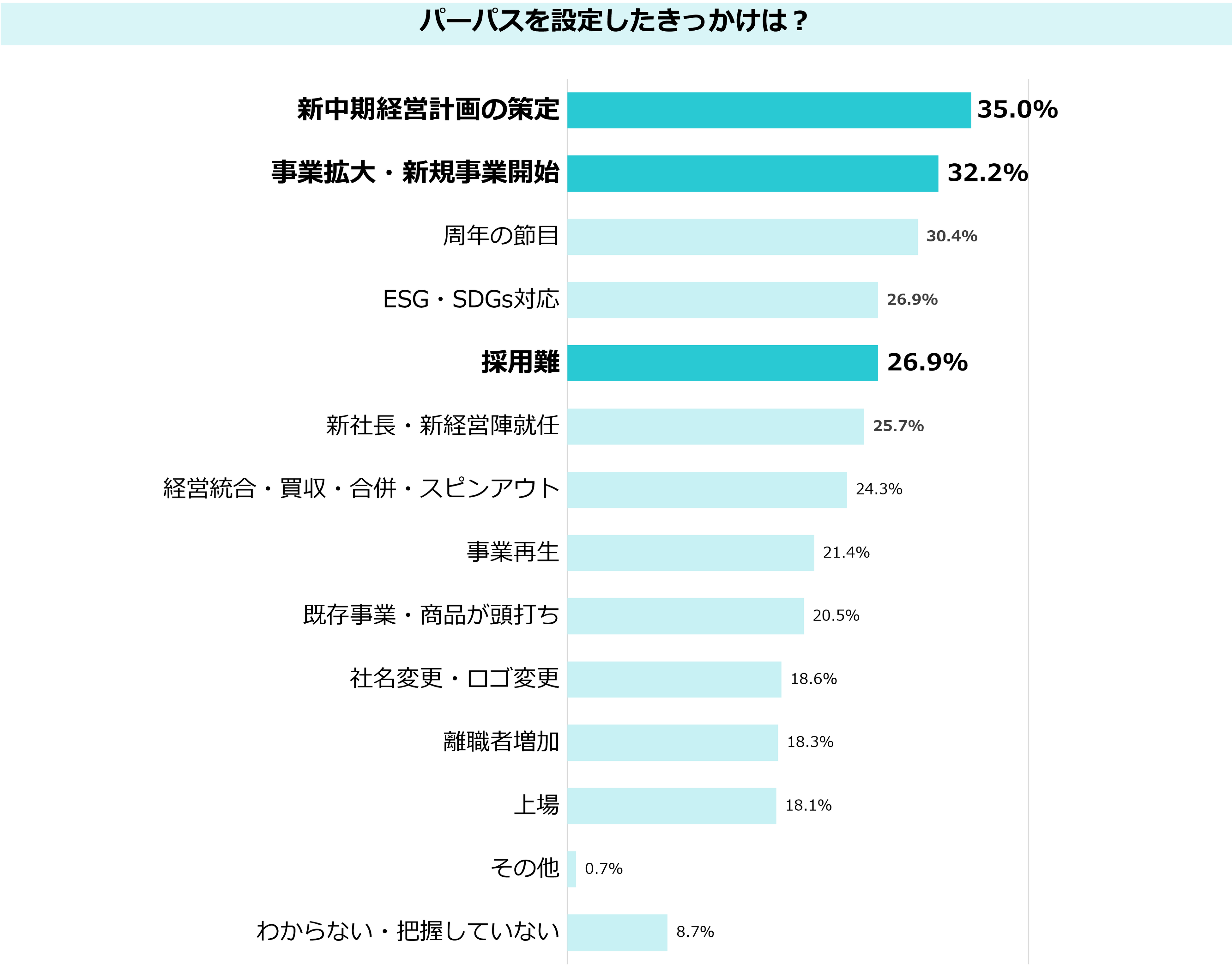 パーパスを設定するきっかけの上位は、「新中期経営計画の策定」や「事業拡大・新規事業開始」という企業の大きな節目ですが、「採用難」をきっかけとしてパーパスを設定する企業が27%いることもわかりました。