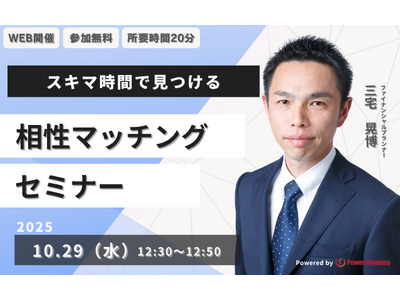 無料マネーセミナー提供サービス「アットセミナー」を運営しているパワープランニング株式会社が「10月29日(水) 12時30分」に「相性マッチングセミナー」というスキマ時間で自分に合ったFPを見つけられるオンラインセミナーを開催いたします。