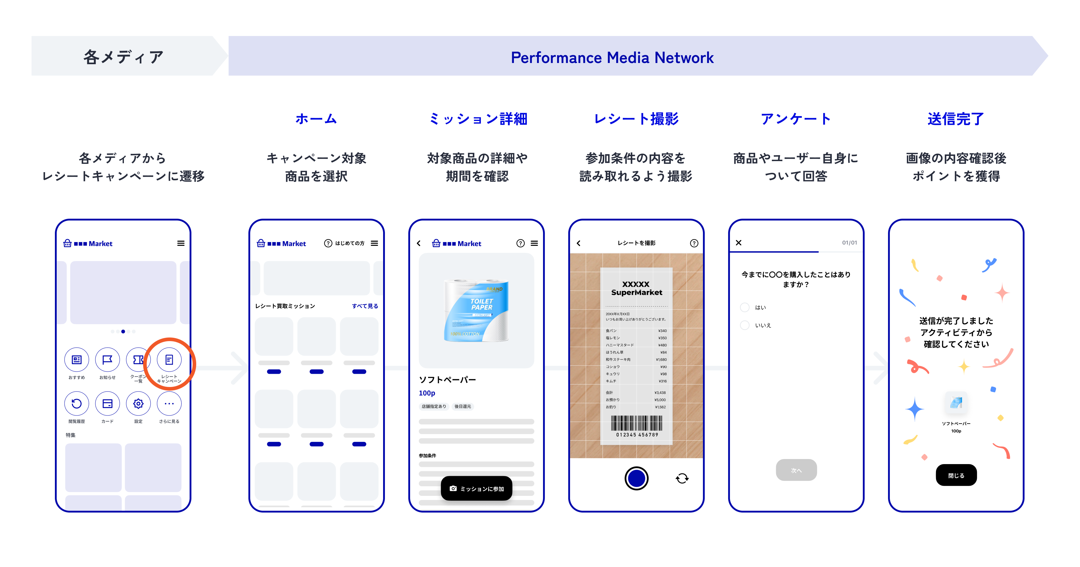 メディアパートナーである各生活者向けアプリのユーザーは、アプリの誘導バナーから詳細情報を取得します。 施策の対象商品を対象店舗で購入後、アプリの誘導バナーからキャンペーンLPに遷移し、レシートをアップロードすることでキャンペーンに参加が可能です。レシートをアップロードし、AI解析による購買判定後に、インセンティブとして、メディアパートナーであるアプリの専用ポイントや「えらべるPay(R)」を獲得することができます。