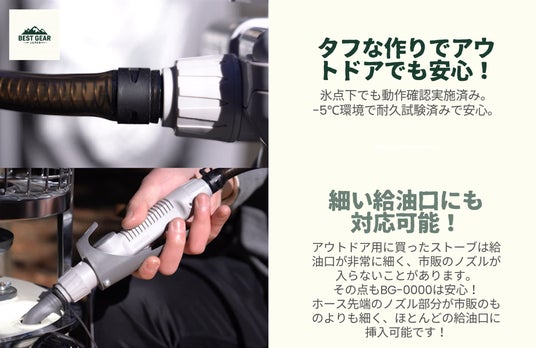 直感的に操作が可能ですので、説明書が無くても誰でもご使用いただけます。また、アウトドアシーンで使用されるストーブは注入口が非常に細い傾向があり、一般に販売されているポンプは挿入することができません。その点もこちらのBG-0000は解消してくれます。