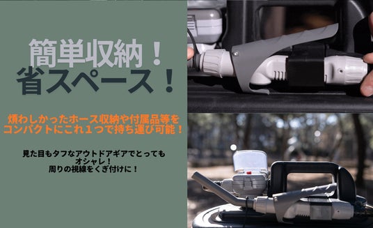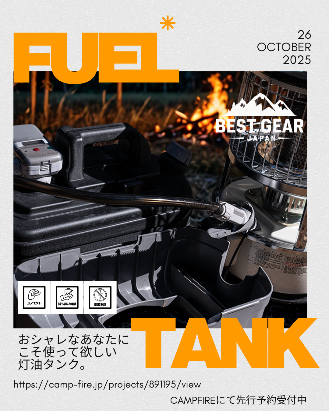 ■ タイトル:”最省スペース” ストーブ用品これ1台!クールなポリタンクセットが日本初上陸!