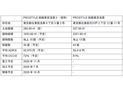 「PROSTYLE 旅館東京浅草II(仮称)」では、「PROSTYLE旅館東京浅草」と連携した運営により、街全体を一つの“宿”と見立てた地域共創型の滞在体験を提供いたします。2028年の開業を目指し、地域文化の継承と観光価値の向上に寄与してまいります。