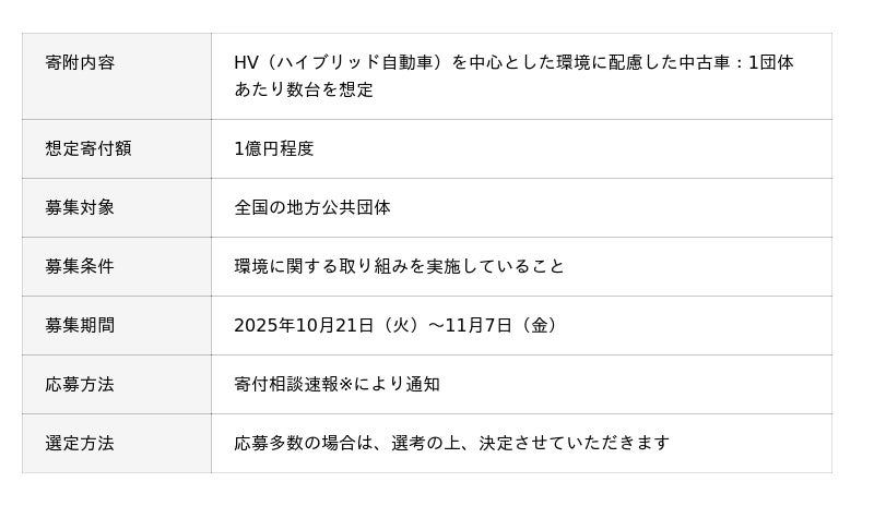 本取組は、環境配慮型のモビリティを地域の選択肢として普及させ、企業と自治体が連携して持続可能な社会の実現に貢献する「循環型社会応援プロジェクト」の一環として実施され、寄附先となる自治体の公募も同時に行われます。