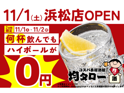 浜松店の新規開店日11月1日(土)と11月2日(日)に「何杯飲んでもハイボールが0円」のハイボール飲み放題オープニングキャンペーンを開催します。また、11月3日(月)と11月4日(火)は通常2,980円の食べ飲み放題を2,500円の特別価格でご提供します。