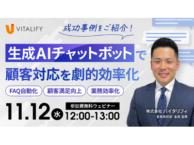 生成AIを活用したSaaSサービスの提供を行う株式会社バイタリフィ(東京都渋谷区、代表取締役:板羽晃司)は2025年11月12日(水)12:00に無料オンラインセミナー、「生成AIチャットボットで顧客対応を劇的効率化」を開催致します。