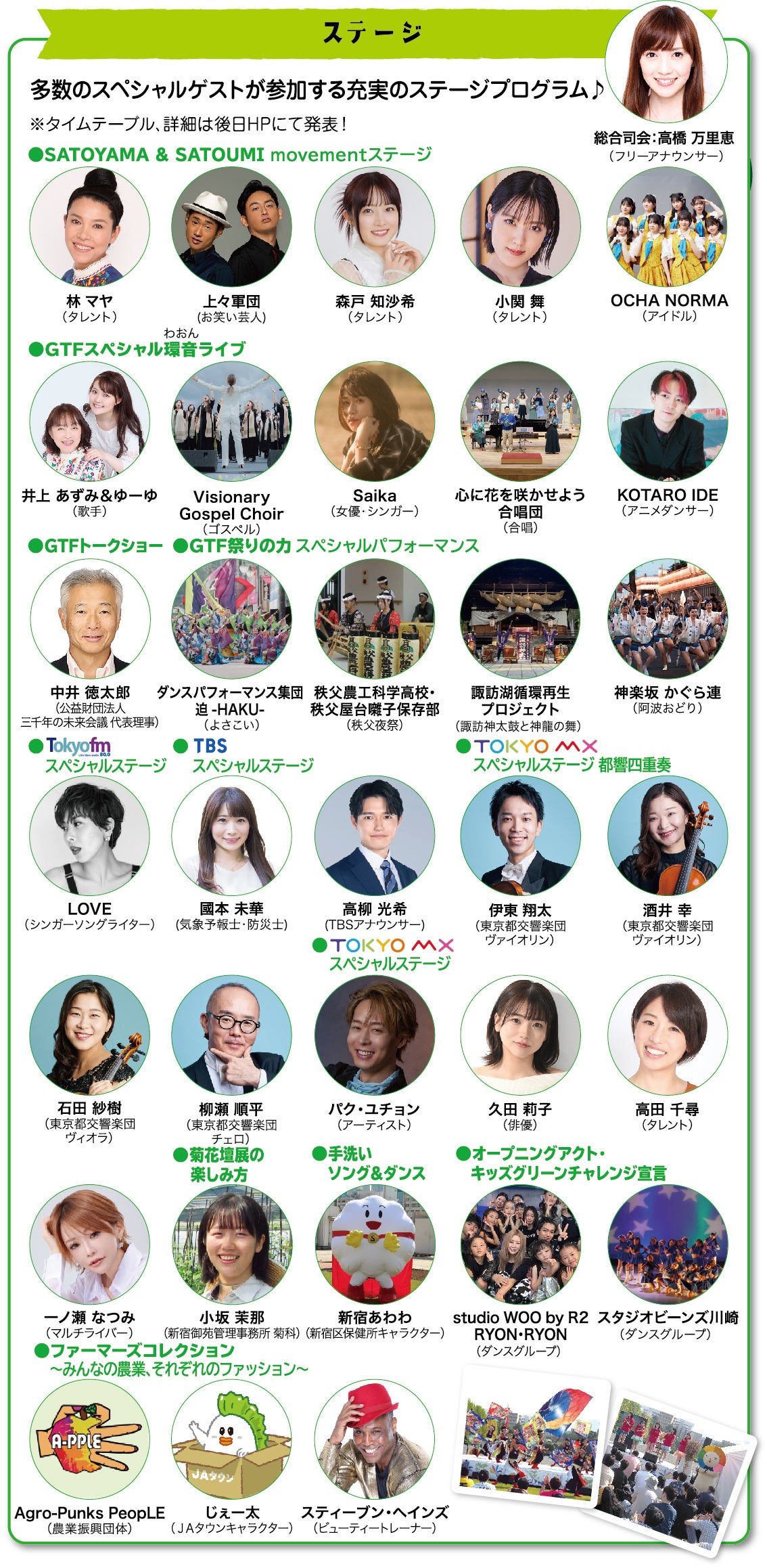 ◆11月2日(日)出演者:スタジオビーンズ川崎(ダンスグループ)、林マヤ(タレント) / 鈴木啓太(お笑い芸人) / OCHA NORMA(アイドル)、小坂 茉那(新宿御苑管理事務所 菊科)、Saika(女優・シンガー)、Agro-Punks PeopLE(農業振興団体)、じぇー太(JAタウンキャラクター)、スティーブン・ヘインズ(ビューティートレーナー)、石田 紗樹(東京都交響楽団 ヴィオラ)、伊東 翔太(東京都交響楽団 ヴァイオリン)、酒井 幸(東京都交響楽団 ヴァイオリン)、柳瀬 順平(東京都交響楽団 チェロ)、Visionary Gospel Choir (ゴスペル)、太田喜久(GREEN×EXPO協会(公益社団法人2027年国際園芸博覧会協会)機運醸成部長)、神楽坂 かぐら連(阿波おどり)、國本未華(気象予報士・防災士)、高柳光希(TBSアナウンサー)