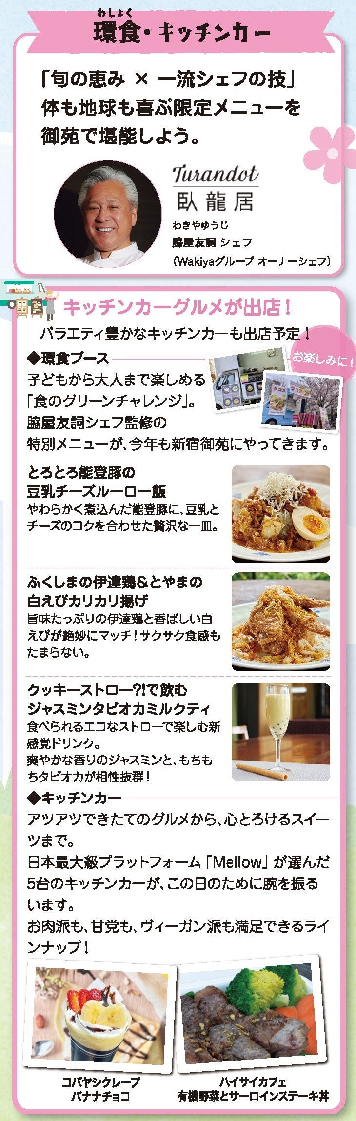 子どもから大人まで楽しめる「食のグリーンチャレンジ」。脇屋友詞シェフ監修の特別メニューが、今年も新宿御苑にやってきます。被災地の食材やサステナブルな工夫を取り入れた、“未来をつなぐ食のグリーンチャレンジ”。ぜひ芝生の上で、一流の技と、旬の味覚を堪能してください。