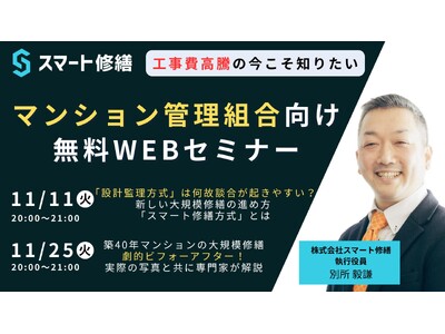 マンションやビルなど大型建物の修繕工事の見積、工事支援サービスを展開する株式会社スマート修繕(本社:東京都港区)は、マンション区分所有者様を対象にした無料のWebセミナーを開催します。
