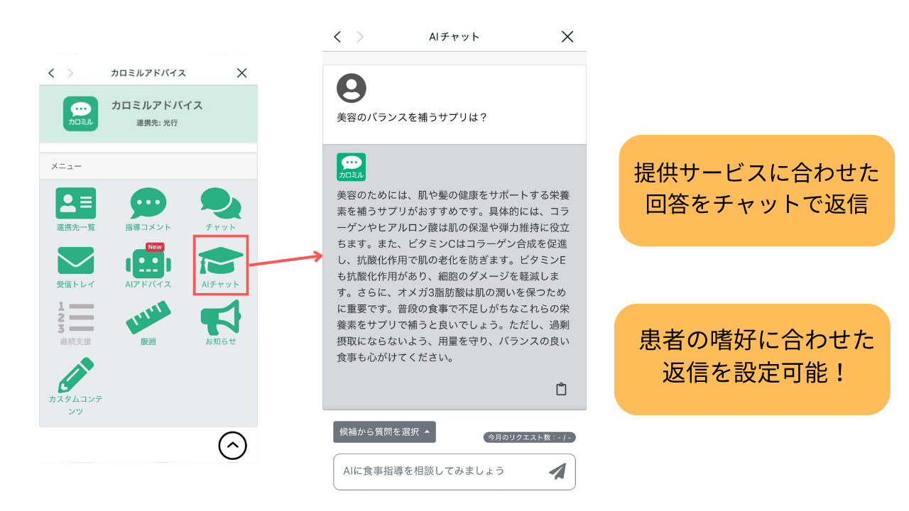 当社が提供する栄養指導ツール「カロミルアドバイス」でも、エンドユーザーが記録した食事データを元に自動で食事アドバイスを生成する「AIアドバイス」機能を展開してきましたが、導入企業からは各社の指導方針などを反映させたカスタマイズ要望が寄せられていました。