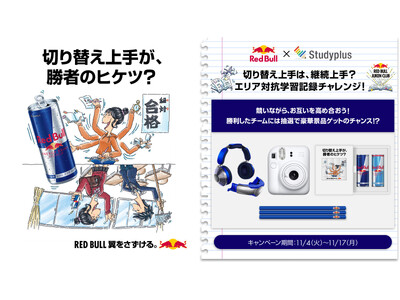 スタディプラス株式会社(本社:東京都千代田区、代表取締役:廣瀬高志、以下:スタディプラス)は、レッドブル・ジャパン株式会社(本社:東京都港区、以下レッドブル)のエナジードリンク「レッドブル」とのタイアップ企画「切り替え上手は、継続上手?エリア対抗学習記録チャレンジ」を、学習管理アプリ「Studyplus」上で2025年11月4日(火)から2025年11月17日(月)までの期間実施いたします。