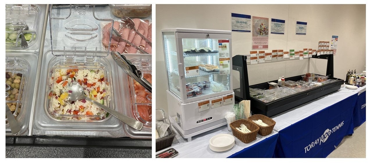 テニスのように長時間にわたる競技では、効率的にエネルギーを補給し、それを維持する「腹持ちの良さ」が特に求められます。本大会では、「カルローズ」の特長である、パラリとした粒感でドレッシングなどの調味料との相性が良い点を活かしたメニューとして「カルローズサラダ」を初提供しました。カルローズ米を炊飯後、野菜と組み合わせ、シンプルにオリーブオイルで和えた、炭水化物、ビタミン、ミネラルも同時に摂取できるメニューです。
