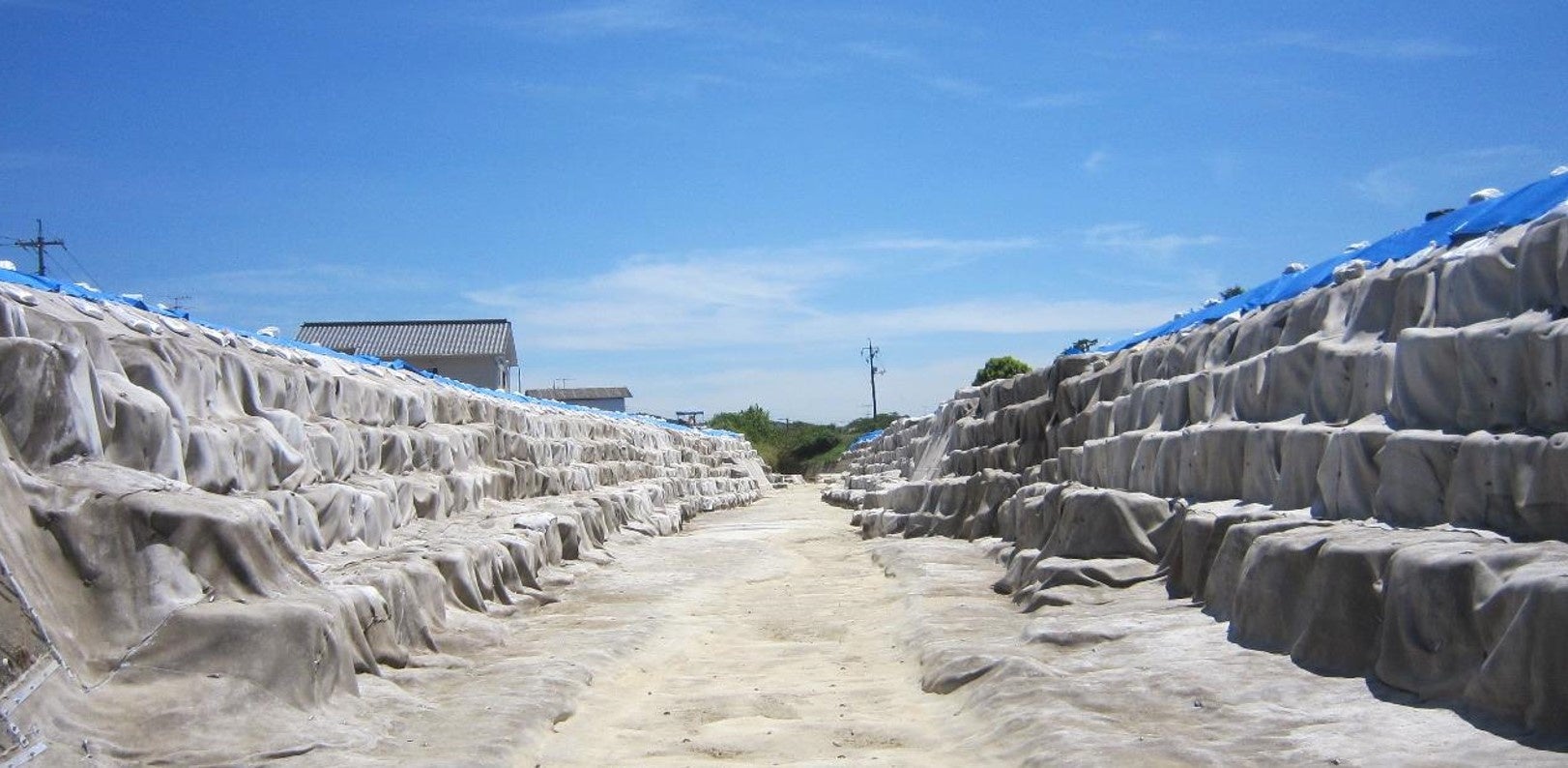 平成30年7月豪雨で破堤した末政川(岡山県真備町)の応急復旧対応に使用されたコンクリートキャンバス(R)