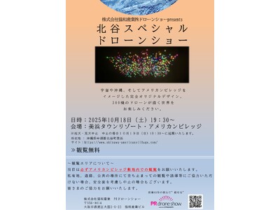 株式会社協和産業(本社:大阪市浪速区 代表取締役:林 万起子)は、2025年10月18日(土)19時30分より、沖縄県北谷町アメリカンビレッジにて「北谷町スペシャルドローンショー」を開催いたしました。本イベントは、宇宙や沖縄、アメリカンビレッジをイメージした完全オリジナルデザインのドローンショーで、300機のドローンが夜空を彩る圧巻のパフォーマンスをお届けし、多くの方にご覧いただけました。
