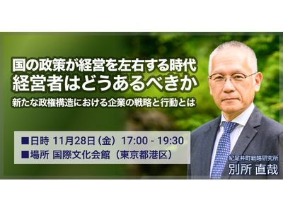 紀尾井町戦略研究所(本社:東京都港区、代表取締役 別所直哉)は、2025年11月28日(金)に当社代表の別所直哉が講師を務める勉強会「国の政策が経営を左右する時代、経営者はどうあるべきか ~新たな政権構造における企業の戦略と行動とは~」を開催します。