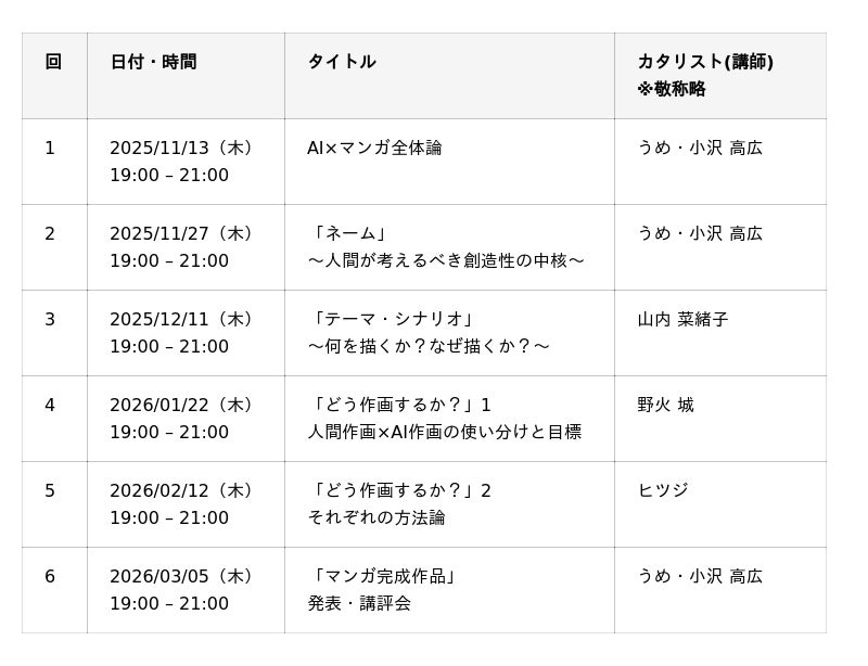 近年、生成AIの普及によって、誰もが短時間で“マンガらしき絵”を作ることが可能になりました。一方で、「絵とセリフを用いて、時間軸をコントロールしながら物語を伝える」というマンガ固有の文法を踏まえ、企図を持った“作品”に仕上げるには、ネーム設計、テーマ/シナリオの定義、作画戦略(人間描画とAI描画の使い分け)などの体系的なプロセスが必要です。本ゼミは、全体監修と3回のカタリスト(講師)を担当するうめ・小沢 高広先生をはじめマンガ制作の第一線で活躍するカタリスト(講師)陣をとともに、こうしたマンガ制作のプロセスを研究×教育×実装の視点から横断し、「生成で終わらせず、作品にする」ための具体的な手順を身につけることを目的とします。