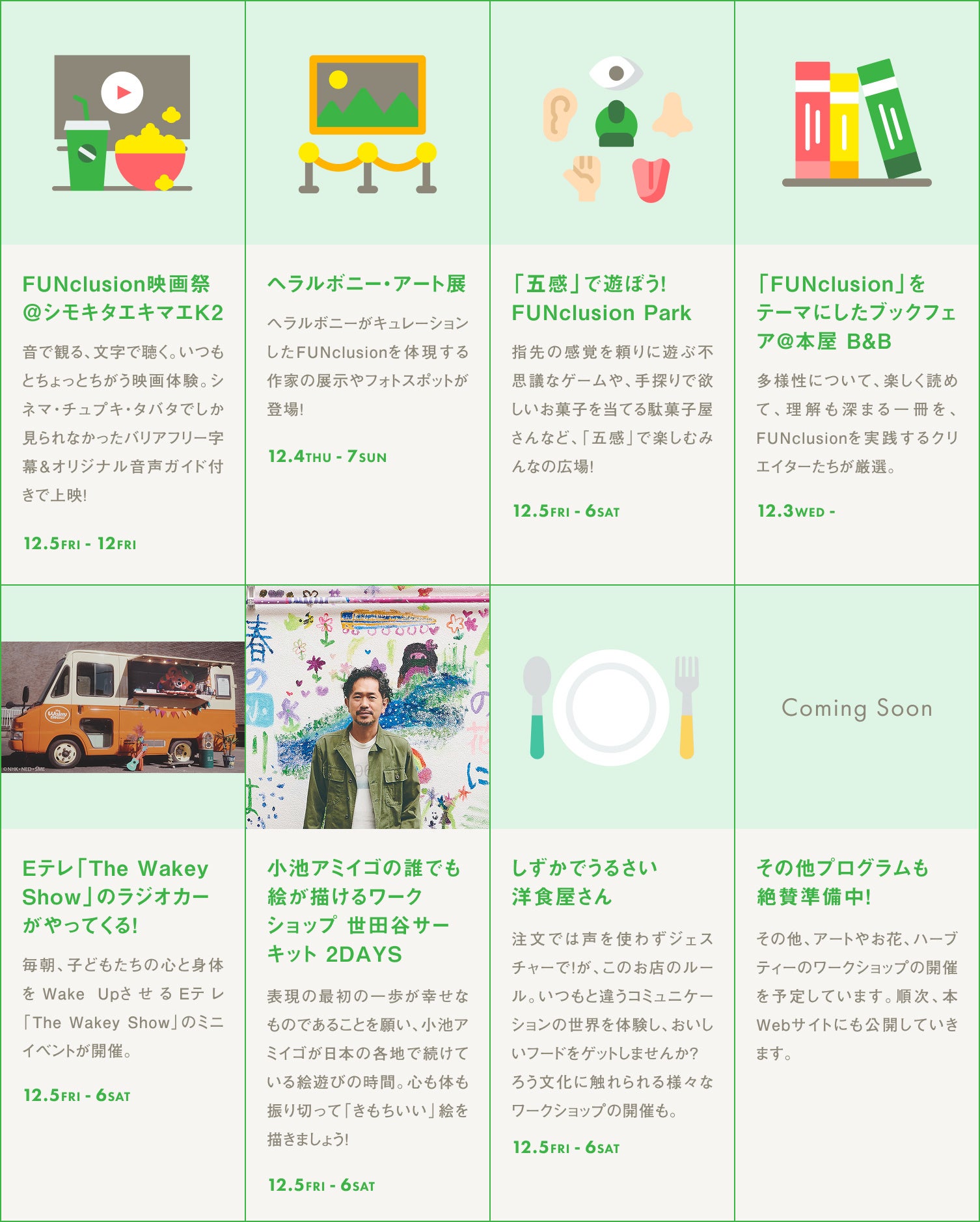 今回開催するイベントは、多様な文化が軽やかに混ざり合う街・下北沢を舞台に 、「FUNclusion 」を体験いただける数々のコンテンツを用意。どなたでも自由に参加することができ、アート展示、映画祭、トークイベント、ワークショップなどを通じて、多様な人々が互いの違いを尊重し、自然と混ざり合う場をつくります。そして、「FUNclusion」な体験をきっかけに、一人ひとりの中にある“あたりまえ”が少し揺さぶられ、世界の見え方が広がっていく--。そんな瞬間が生まれることを願っています。