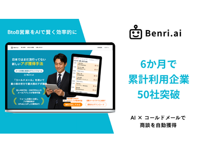 Benri.ai株式会社は、同社の提供する「AI」×「コールドメール」を活用したBtoBアウトバウンド営業支援サービス「Benri.ai(ベンリエーアイ)」の正式リリースから6か月で、累計導入企業数が50社を突破しましたことをお知らせいたします。Benri.aiは、コールドメールという新しい手法に独自の企業データとAIカスタマイズを掛け合わせることで、従来のアウトバウンド営業に比べ、工数を大幅に削減しながら商談創出の再現性を高めることを実現しています。
