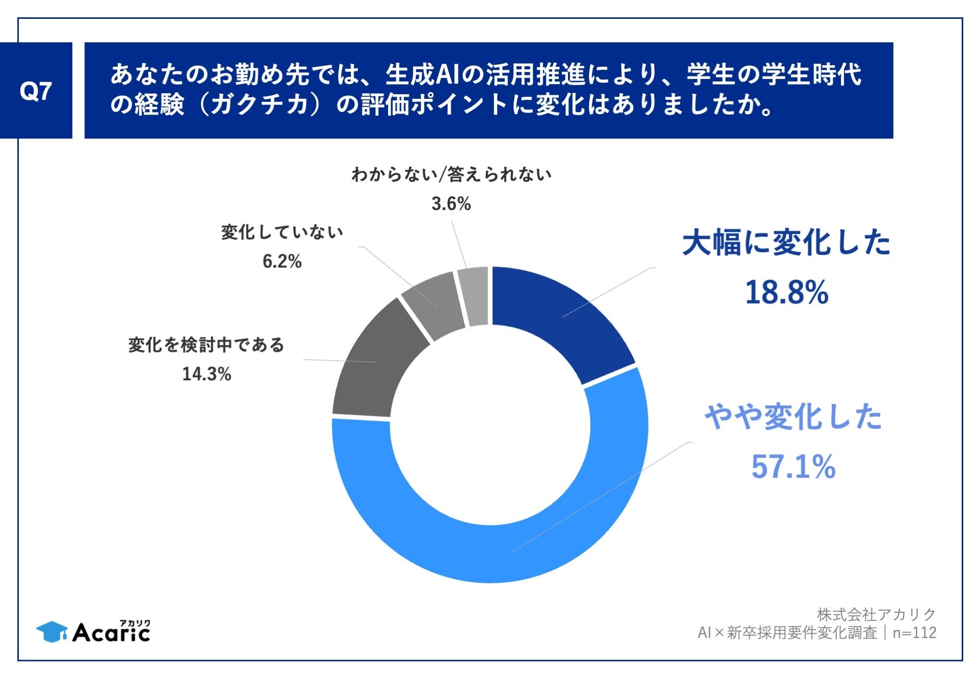 「Q7.あなたのお勤め先では、生成AIの活用推進により、学生の学生時代の経験(ガクチカ)の評価ポイントに変化はありましたか。」(n=112)と質問したところ、