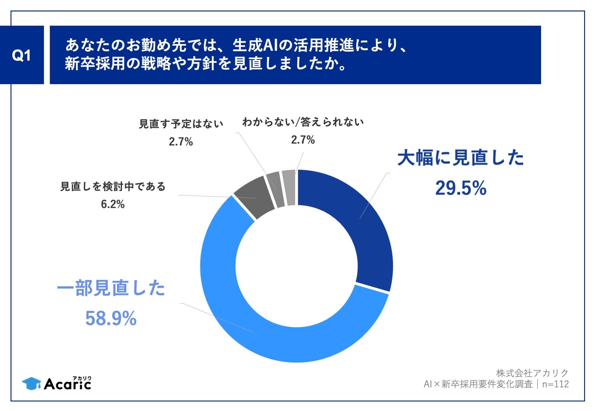 「Q1.あなたのお勤め先では、生成AIの活用推進により、新卒採用の戦略や方針を見直しましたか。」(n=112)と質問したところ、
