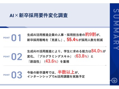 まず、生成AI活用を推進している企業における新卒採用戦略の変化について、約9割が戦略や方針を「見直した」と回答しました。見直しの理由として最も多かったのは「生成AIを活用できる人材を重点的に採用したいから」(66.7%)で、次いで「競合他社の採用戦略が変化したから」(43.4%)、「従来の業務スキルよりも新しい能力が重要になったから」(40.4%)となっており、採用人数についても、55.4%の採用担当者が「減少した」と回答しています。また、学生に求める能力・スキルも84.0%が「変化した」と答えており、具体的には「プログラミングスキルの重要度が上がった」(63.8%)や、「創造性・発想力をより重視するようになった」(43.6%)が上位に挙げられています。さらに、学生時代の経験(ガクチカ)の評価ポイントも約8割が「変化した」と回答しており、「新しいツールへの適応力」(65.9%)や「創造的な取り組み」(56.5%)をより評価するようになっています。最後に、今後の新卒採用については、「インターンシップで生成AI活用課題を実施する」(54.5%)や、「採用人数をさらに調整する」(39.3%)などが検討されています。