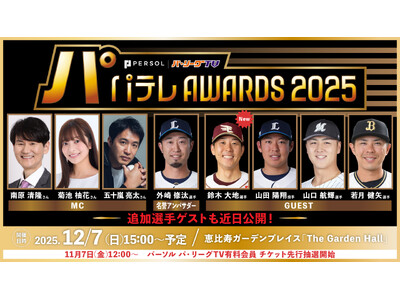 「パテレアワード2025」のチケットは11月7日(金)12:00より、パーソル パ・リーグTV有料会員向けに先行抽選申込を開始いたします。また当日はパーソル パ・リーグTVおよびパーソル パ・リーグTV公式YouTubeチャンネルでのライブ配信も実施予定です。ぜひ今年のプロ野球パ・リーグを振り返りながら、球団の垣根を越えたそれぞれの選手のトークが楽しめるパテレアワードにご注目ください!