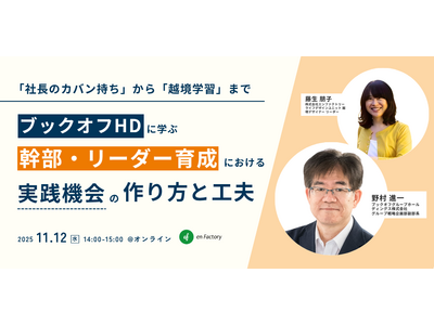 株式会社エンファクトリー(東京都千代田区、代表取締役社長CEO加藤健太)は、2025年11月12日(水)14:00-15:00にて、『「社長のカバン持ち」から「越境学習」まで~ブックオフHDから学ぶ、幹部育成における「実践機会」の作り方と工夫~』セミナーを開催します。(詳細はこちら:https://ldu.enfactory.co.jp/20251111)