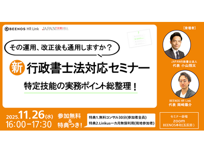 2025年11月26日(水)、16:00~17:30に「その運用、改正後に通用しますか?特定技能の実務ポイント総整理!新・行政書士法対応セミナー」を開催します。